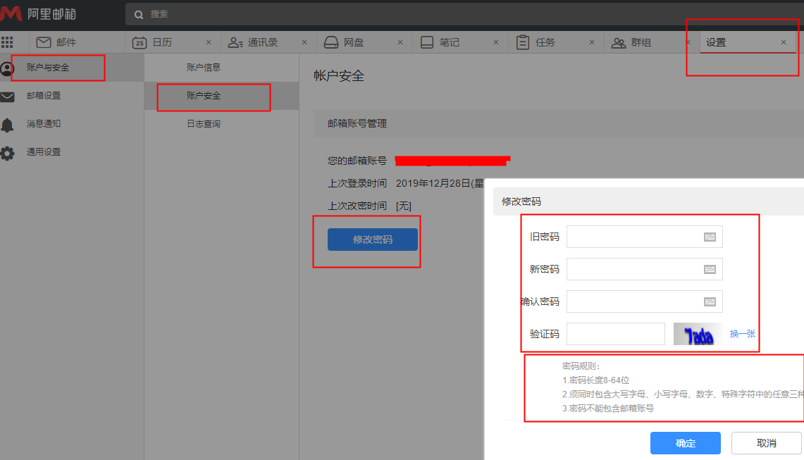 1、登录邮箱后点击右上角“邮箱设置”,在左侧展开设置功能列表中点击“账户安全",输入旧密码、新密码确认后保存即可。