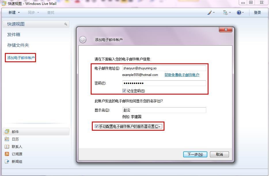 1.打开 Windows Live Mail 后单击左侧添加电子邮件账户 ,填写您的邮件地址和密码,单击 下一步 ,如图: